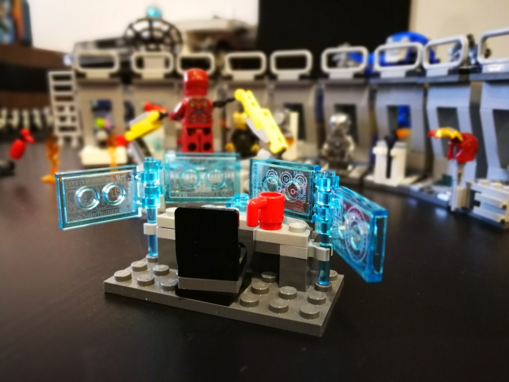 You’ve got the awesome translucent-blue screen desk, the coffee maker and cup for some brain help, that rotating podium with 2 posable robotic arms (which I still see in my head as the one from Avengers Assemble), and all the modules are detachable and movable, as you wish. Oh, importantly, you get Stark’s face and hair elements so you can swap him in and out of the various suits.
