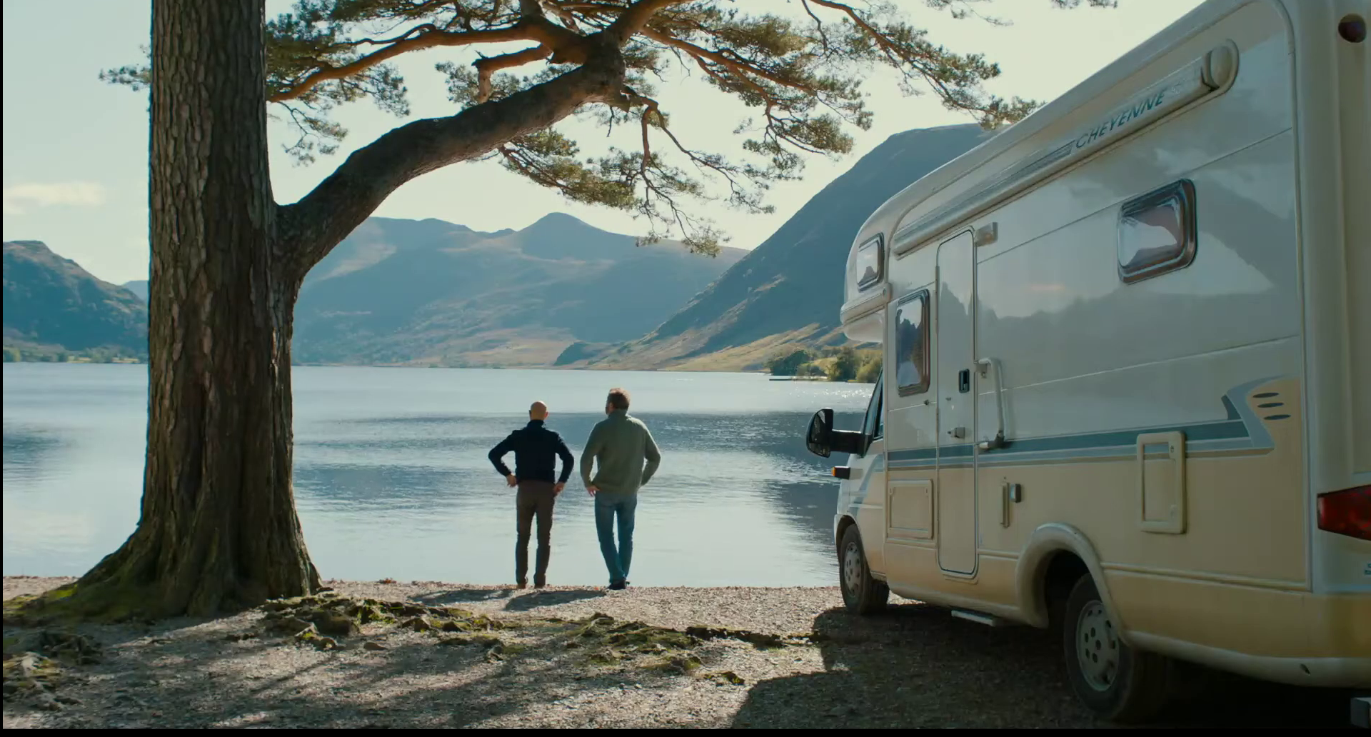 These purposes come quickly because after a brief roadside café breakfast and shop, Sam can’t find Tusker when he returns to the camper. Speeding off up a nearby lane, he finds him with the dog – that he’d obviously taken for a walk – but with Tusker’s dementia, he doesn’t know where he is, or how he got there. But, here’s the clever shot, Macqueen films is from inside the camper, so it’s framed in the distance and you can read the situation from their actions, it’s absolutely heart-breaking to witness and broke me from this first moment.