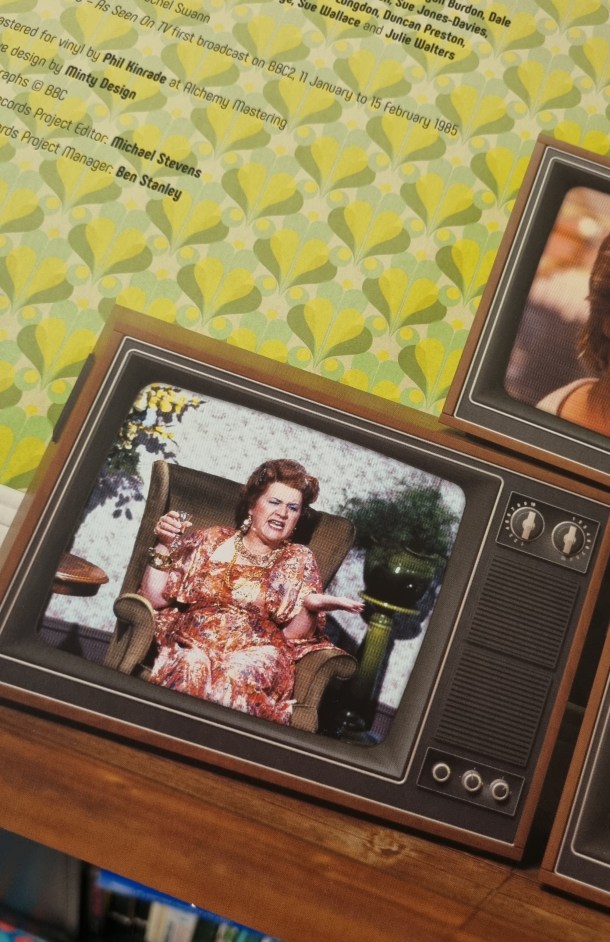 The vinyl itself comes as two 140g vinyl LPs (one green and one brown) that are presented in an illustrated gatefold sleeve with images from the TV show. There are cast-lists on the sleeves of the records, and inside is an exclusive sleeve note by Jasper Rees, author of the bestselling Let’s Do It: The Authorised Biography of Victoria Wood and Victoria Wood Unseen on TV, and his words are a lovely tribute.