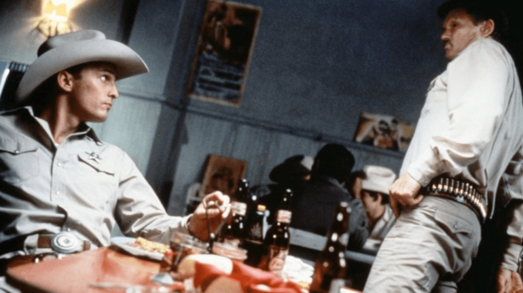 Sam Deeds (Chris Cooper) is the sheriff of Frontera, a small Texas town with rising tensions in the multi-cultural population in the lead up to a celebration of local legend, and Sam’s father, Buddy Deeds (played in flashback by a pre-stardom Matthew McConaughey). When two soldiers on leave dig up a human skull and a sheriff’s badge, it sets in motion an investigation into the disappearance of corrupt sheriff Charlie Wade (Kris Kristofferson), an inquiry that threatens to tarnish the reputation of Sam’s father. It’s a development not entirely unwelcome for the younger Deeds, who knew a very different man to the revered Sheriff the town worships, and despite the pressure from the mayor (Clifton James) and local business owners, he endeavors to uncover the truth, regardless of the consequences. Mirroring Sam’s relationship with his father is the presence stiff-necked Colonel Payne (Joe Morton) the newly appointed head of the local military base, whose own relationship with his estranged father (Ron Canada) is equally fraught.