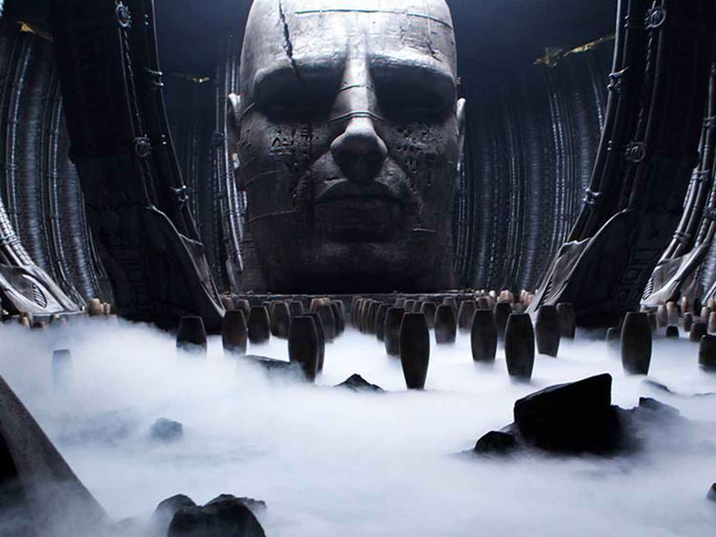 The alternate beginning isn’t really that alternative and something you’ve already seen, if you’ve watched any TV advert recently or searched for answers to your questions. There is still the sacrifice of the giant, luminous white ‘man’ but this time he’s given that mysterious cup of deathly liquid by a group of white-faced hoodies. His DNA crumbles and rips apart his existence as he tumbles piece-by-piece into the Icelandic/generic desolate landscape waterfall, thus indicating this is most definitely a sacrificial act to the hovering spacecraft above them. But this still raises the question, who are the ‘Gods’ above them?