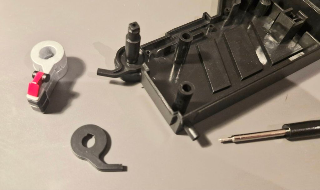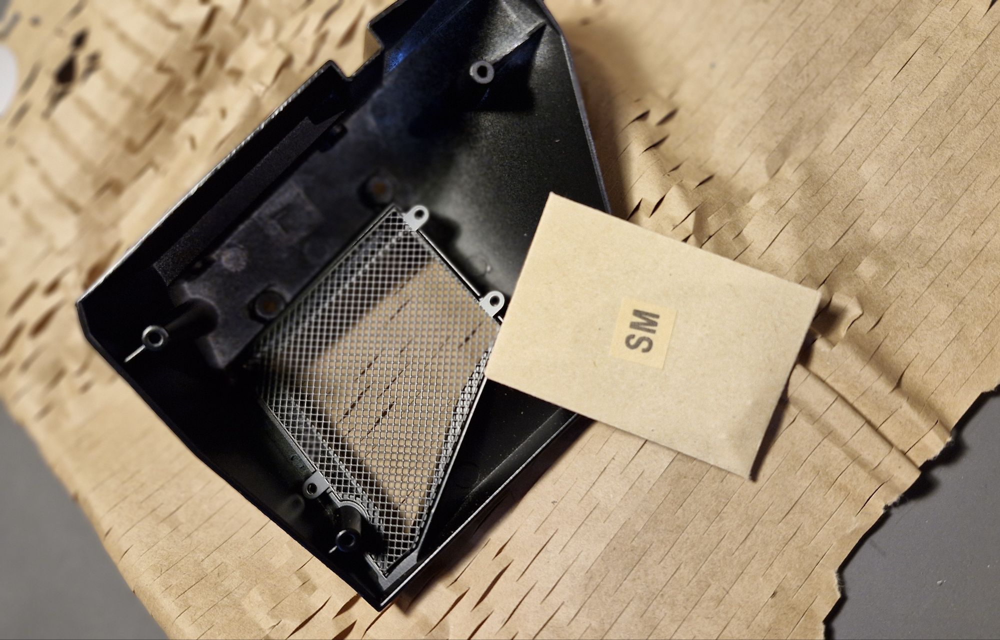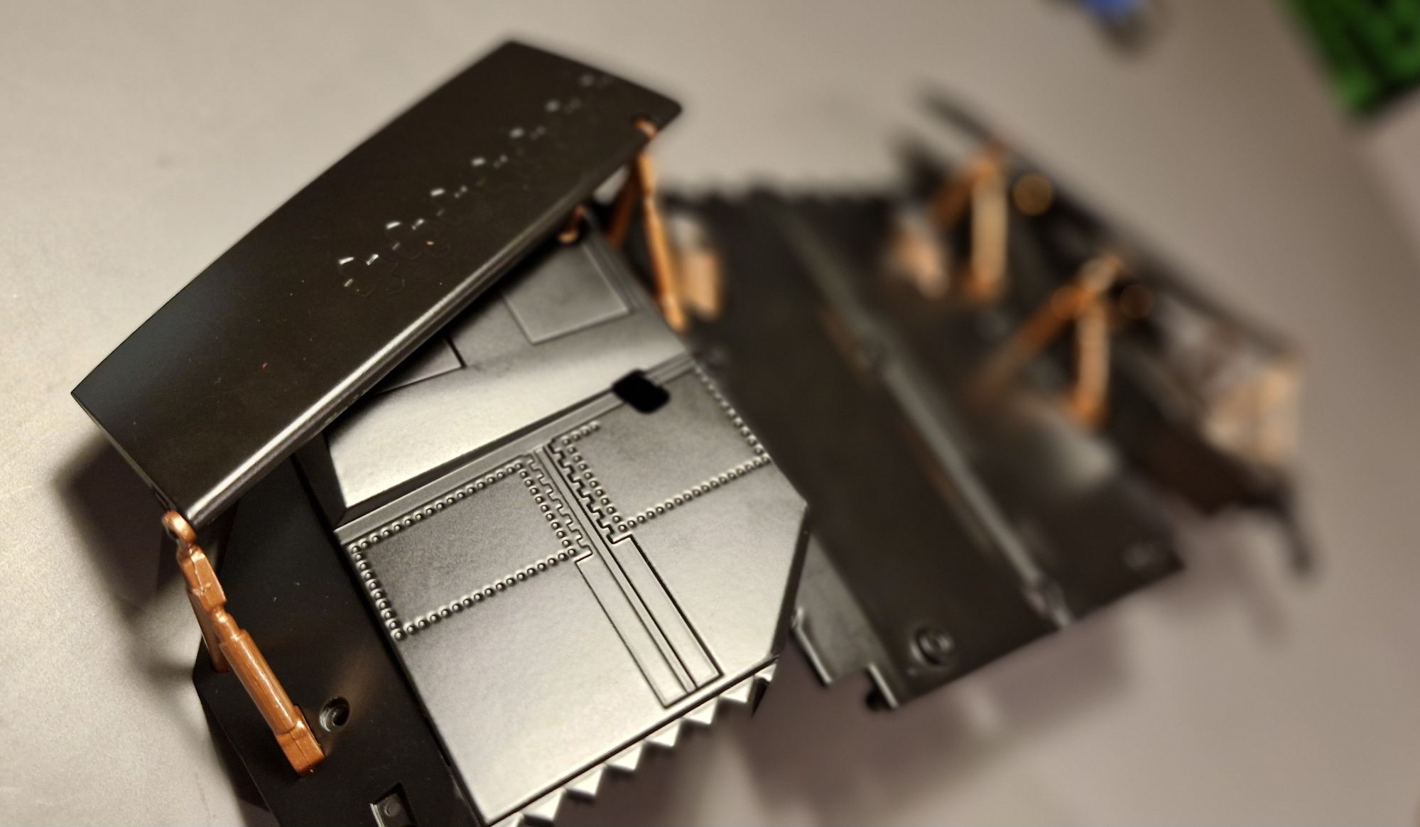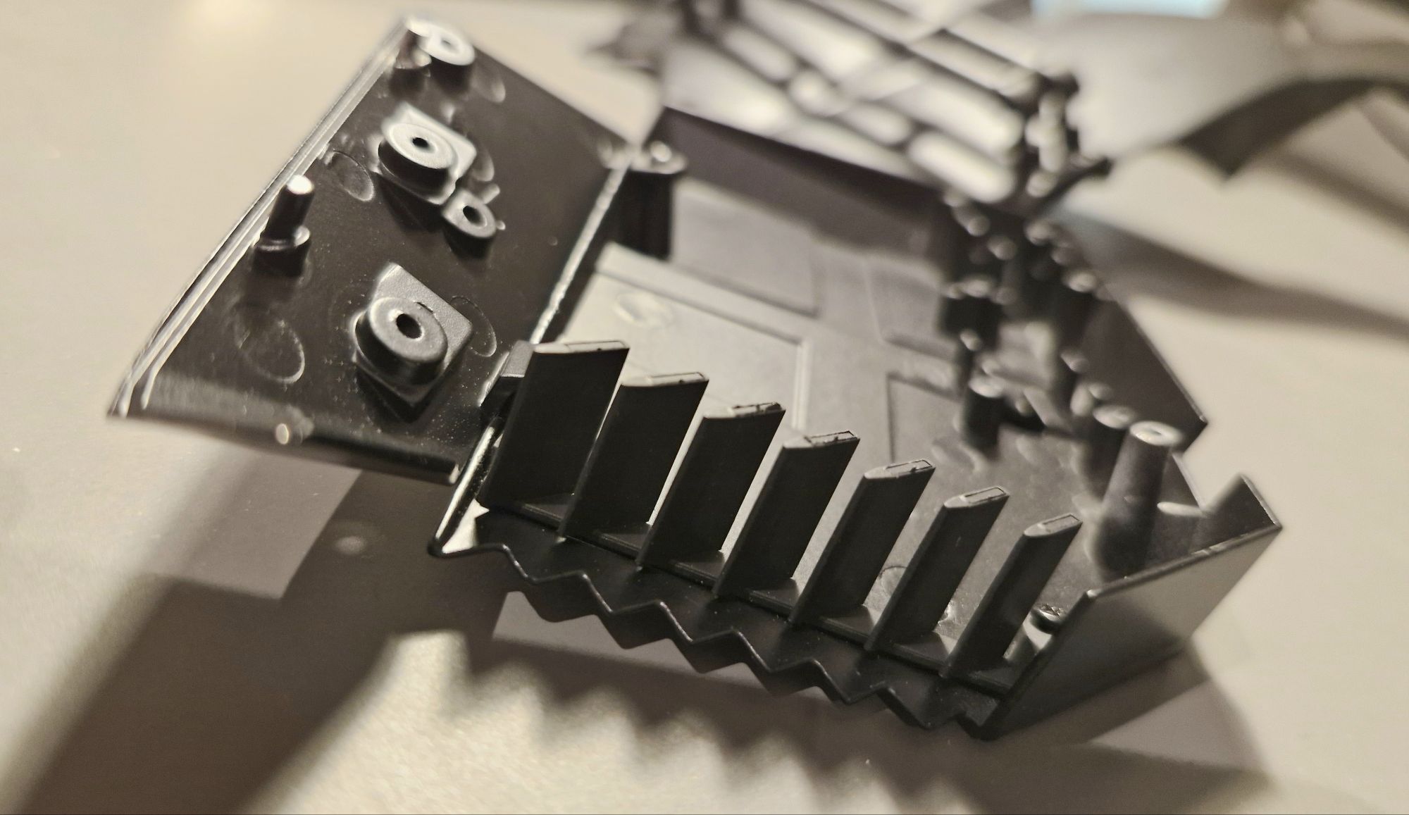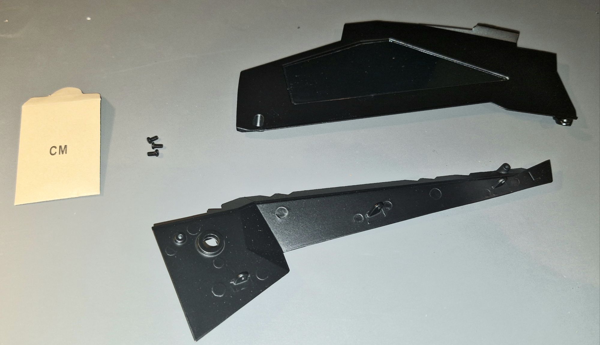 Next is the putting together of two spoilers and a deflector, or left air intakes and an intake baffle – which I’m sure I ate once in an American Diner. Essentially, the wonderfully named ‘intake baffle’ is screwed onto the bottom of the intake, and it kinda looks like a little grate like you’d get on the outside of an air vent. It does suggest tweezers, but if you’re delicate enough you can use your fingers to hold it whilst doing the necessary SM screw work. It’s a pretty quick job.