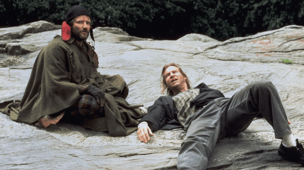 This sentiment shapes the characterisation in The Fisher King . We’re so used to the polished perfection of characters in modern Hollywood that the more unattractive traits of the four main characters here is jarring, but incredibly refreshing. Jack’s transformation from self-absorbed jerk to something resembling a good person is especially well-handled. Bridges plays the role broad and obnoxious, leaning into Jack’s self-serving nature. His redemption doesn’t come at the point where we might expect it to, and clearly not when *he* thinks it does. He doesn’t help Parry out of selflessness but simply to ease his own guilt, just reinforcing his own narcissism. Only at the film’s climax, when Jack finally chooses to help Parry for Parry’s own sake, does he truly begin to change. It’s one of the rare cases where a heel-turn like this feels truly earned.
