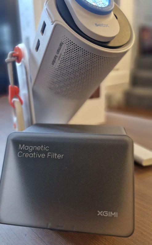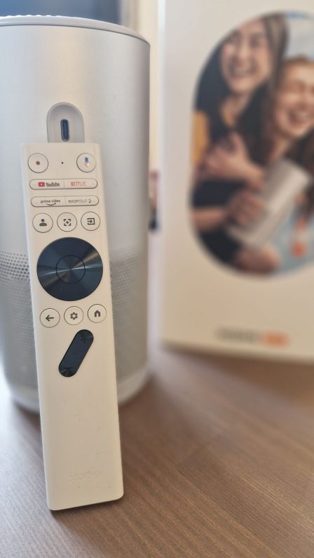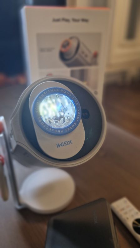 As a unit, it’s a solid plastic cylinder that feels both bulky and secure, in a way you’d want it to, given the technology inside. The cover for the lens itself is also magnetic, and you open it by pulling it out gently and then (approximately) turning 150>180 degrees as, resourcefully, it’s also the strong base for the unit upon which it will sit – and that’s also alterable by 360 degrees, so you can project on the ceiling, on the wall or wherever. Also, this ‘PowerBase’ stand has 20,000mAh built-in power bank, which isn’t loud either once when its running.